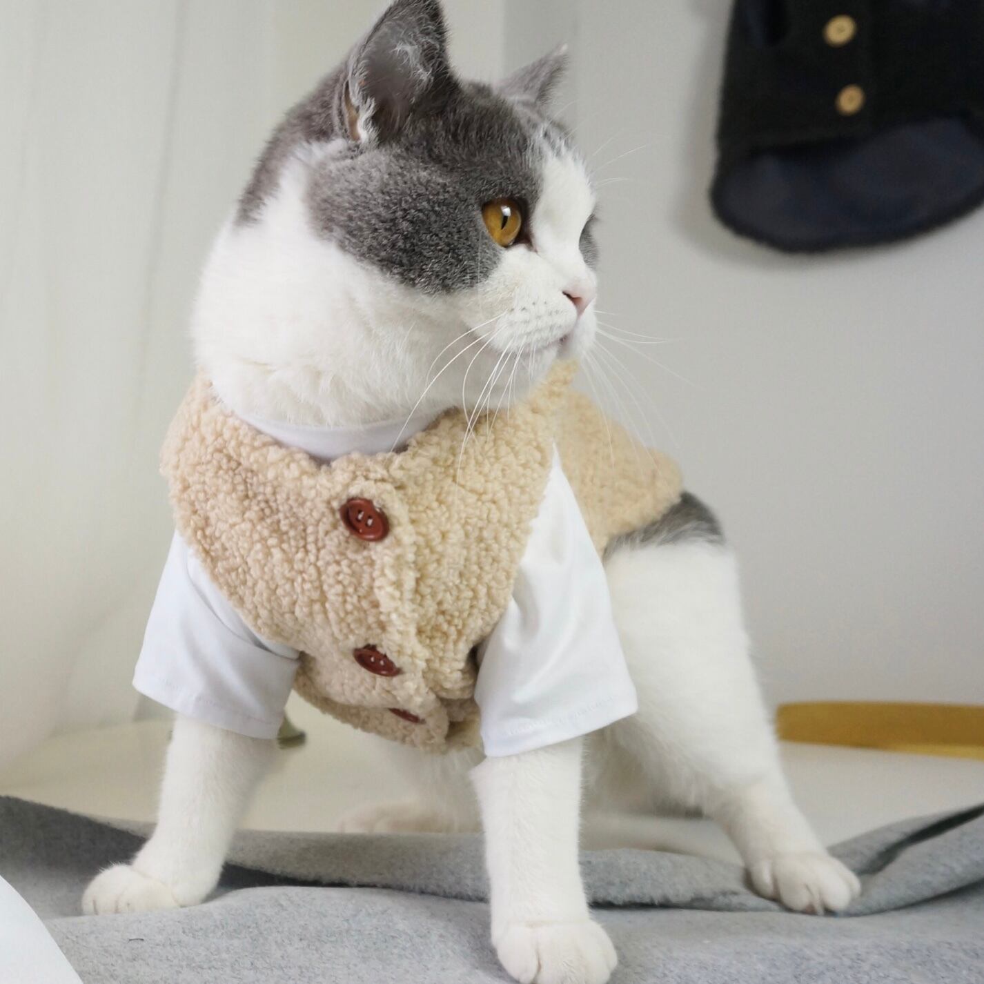 ボア生地にウッド調のボタンが